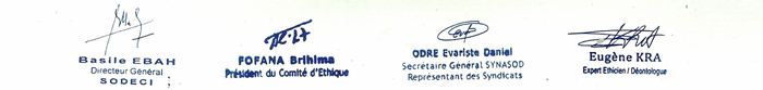 | Chaque collaborateur s'engage à appliquer les principes et les valeurs de la présente charte d'éthique.Un comité d'éthique est mis en place pour assister et conseiller les collaborateurs sur toutes les questions relatives à notre charte d'éthique. Fait à Abidjan. le 11 Décembre 2014 |